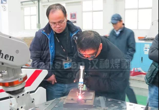 何曉陽董事長陪同劉建峰總工藝師一行參觀無錫漢神展廳、生產(chǎn)車間,詳細(xì)了解無錫漢神焊接機器人、手持激光焊接機等產(chǎn)品的生產(chǎn)情況。在手持激光焊接機現(xiàn)場,來賓們親自體驗了手持激光焊帶來的震撼,讓來賓們贊嘆并激發(fā)了對手持激光產(chǎn)品的濃厚興趣。緊接著來賓們看了我們的自動化焊接,對公司在傳統(tǒng)產(chǎn)業(yè)轉(zhuǎn)型升級方面取得的成績給予肯定。